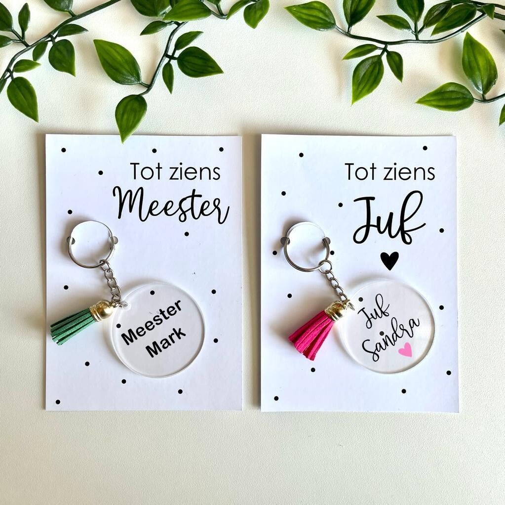 - Met naam: Een persoonlijke sleutelhanger die de juf of meester altijd bij zich kan dragen.