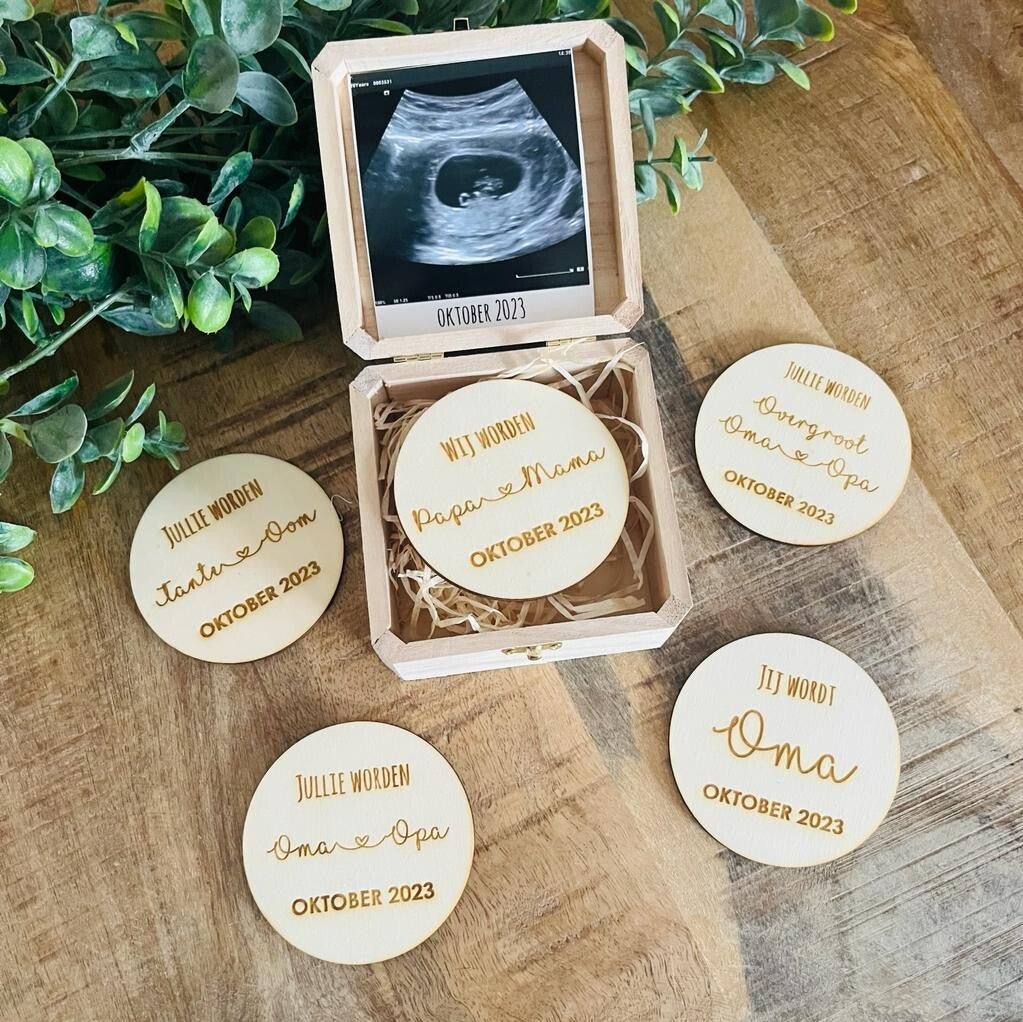 Maak het delen van het mooiste nieuws nog specialer met een uniek houten doosje als geboorteaankondiging. Dit doosje bevat een boodschap en je kunt een echofoto toevoegen voor een persoonlijke touch. Inclusief een houten munt met eigen tekst om dierbaren op een bijzondere manier te verrassen.