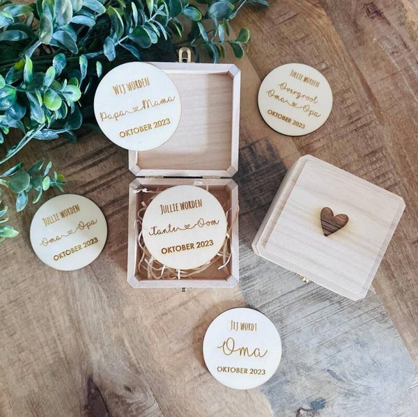 - Unieke Presentatie: Het houten doosje maakt de aankondiging stijlvol en onvergetelijk.