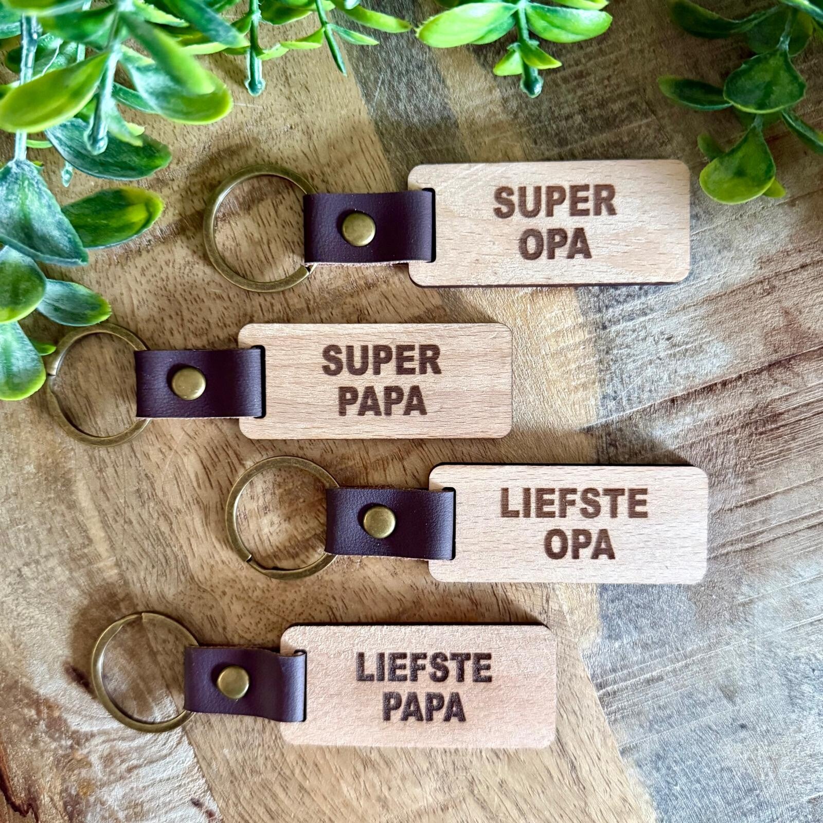 Een stoer en warm cadeau voor Vaderdag! Deze houten sleutelhanger heeft een lederen bandje. Kies jouw favoriete tekst voor papa of opa – super of liefste, het zegt precies genoeg.